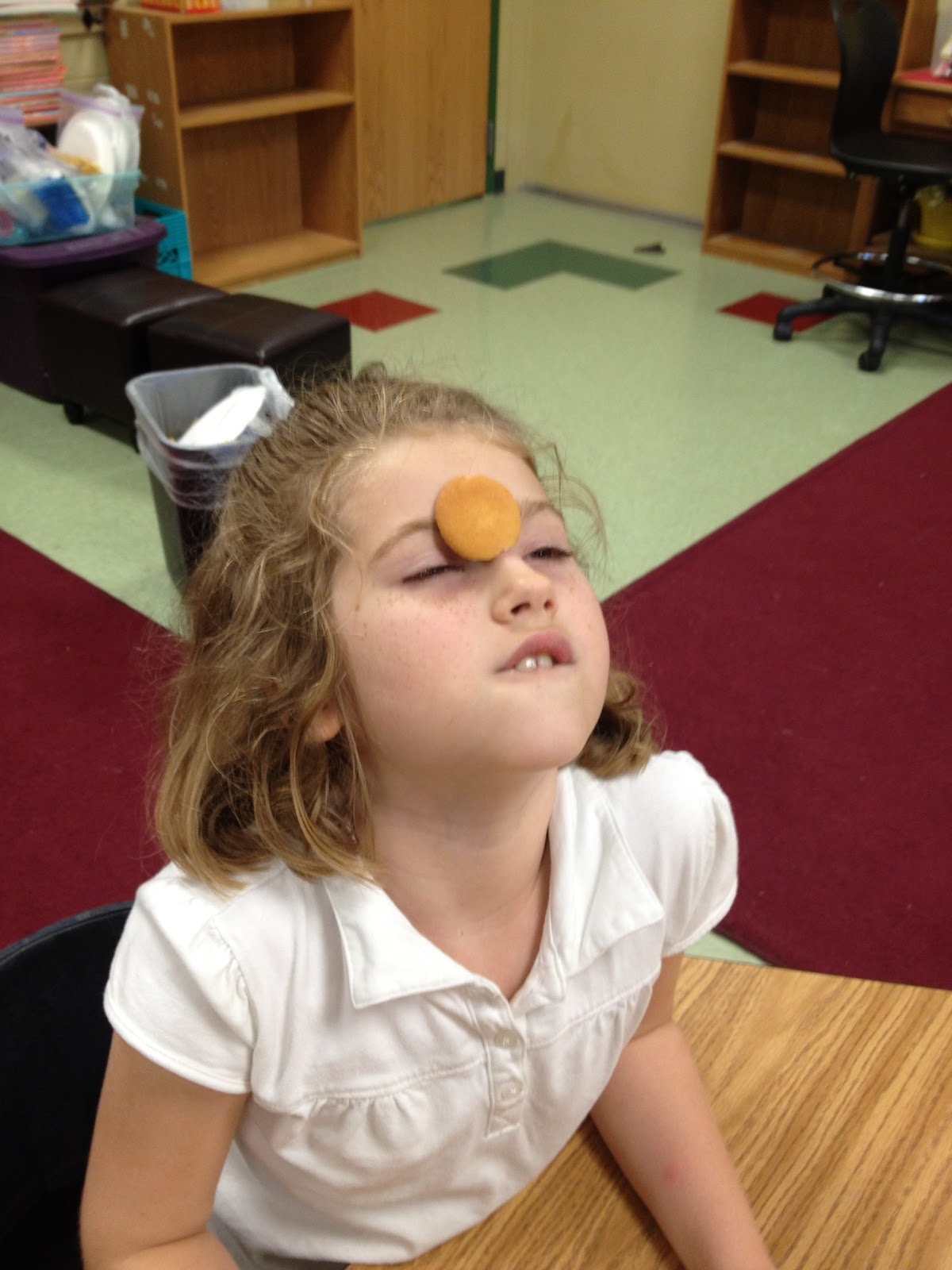 You have to get a cookie (nilla wafer) from your forehead to your mouth with only scrunching your facial muscles. HILARIOUS! Very tough…few did it. But I modeled it and they died laughing. My cookie did NOT make it into my mouth.