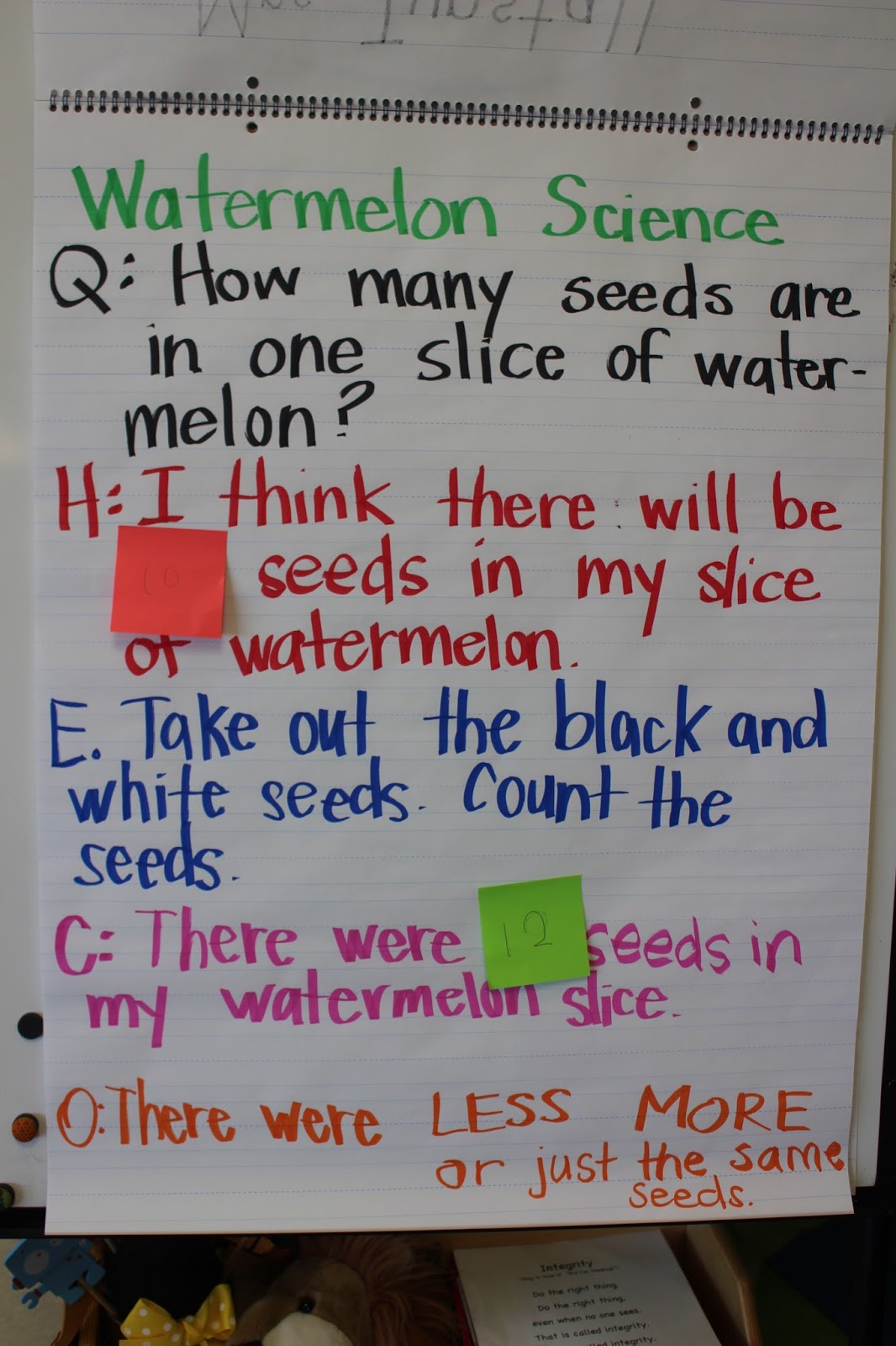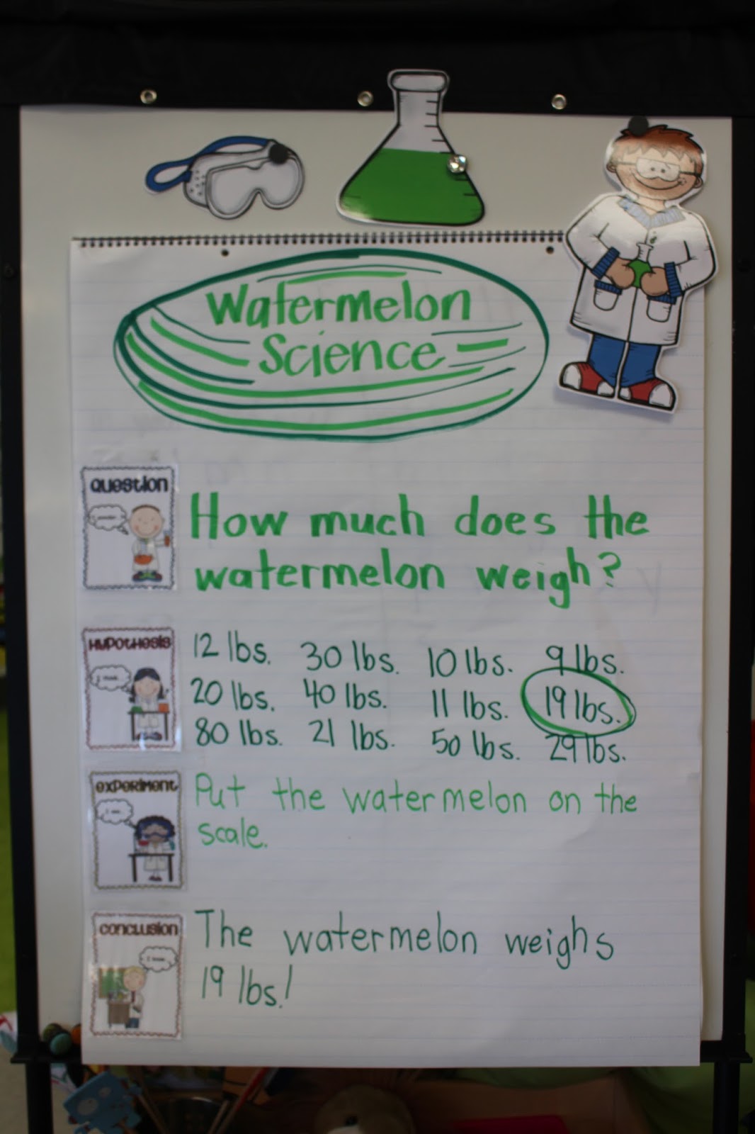 Once our watermelon was safely returned to our classroom, we introduced the scientific process. Then we jump right in and try it out! I am not going to apologize for my on the spot handwriting. I am a lefty and I do my best…which is about a fifth grade level of handwriting. Ok third grade tops.