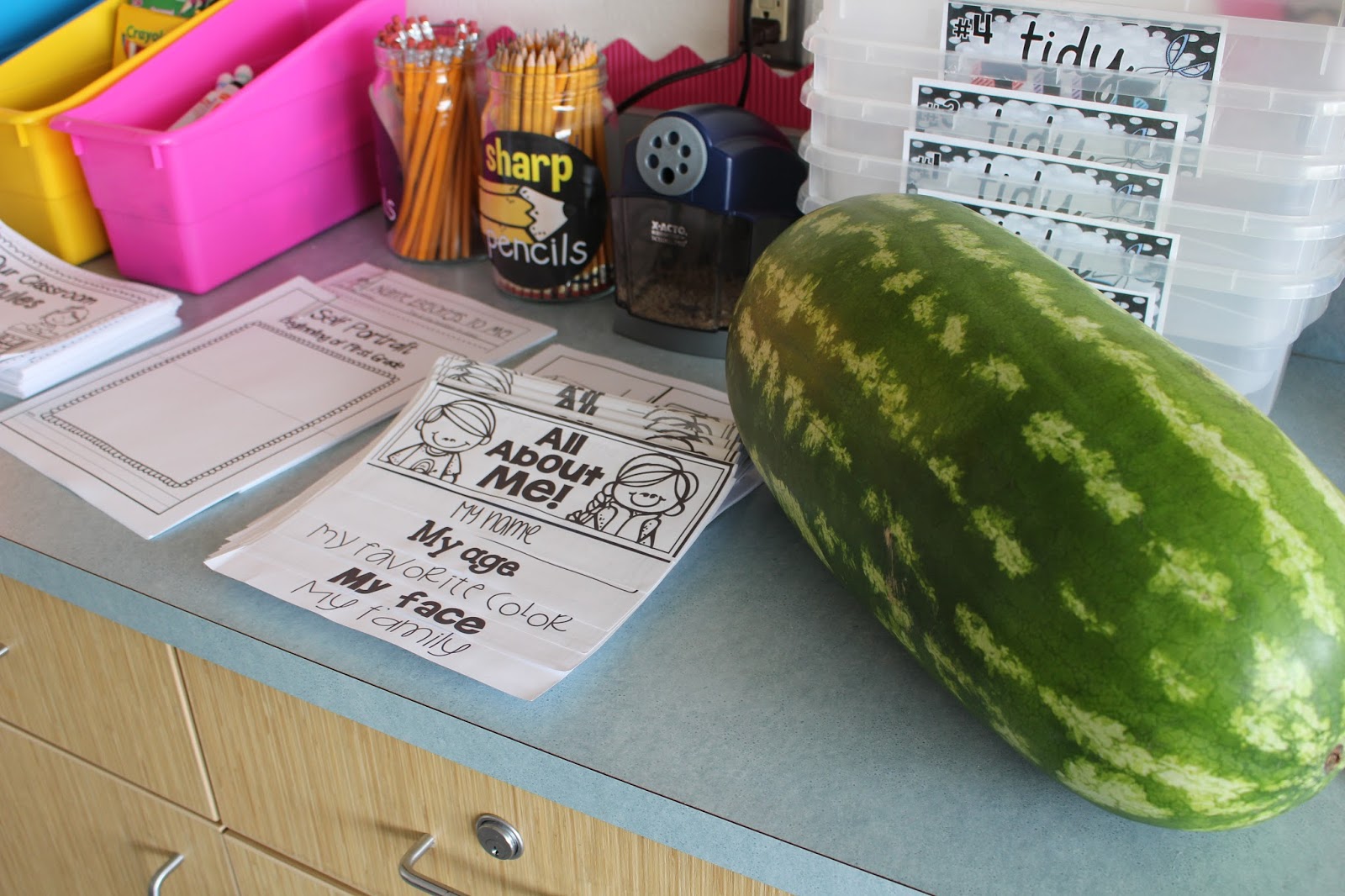 My teammate made the cutest watermelon clue cards and set them around the building for all of first grade to share as we toured the school becoming familiar with places and procedures. Our principal had our watermelon and a treat for us in her office. Of course I have no pictures of any of this fun due to the fact that I was trying to herd my brand new first graders around the school in “number order”. This concept being new and very grown up was also very difficult for some which caused others to lose their little minds when the order wasn’t perfect. Yup. It’s coming folks. Good times…
