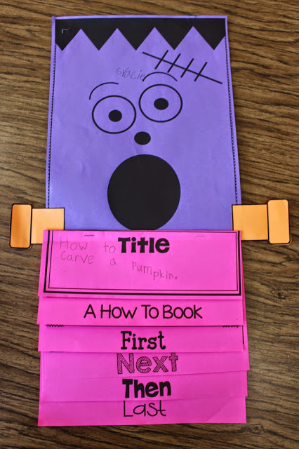 Last year I used the template to help us understand writing a HOW TO piece. We wrote, How to Carve a Pumpkin. You can also choose the template in the first picture (and in the video) that helps students write a summary based on story elements. I love that even my first graders can do this because it is so scaffolded.