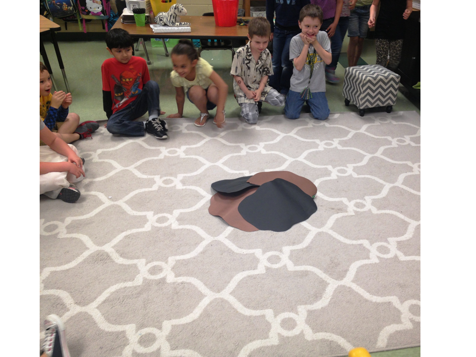 These pictures are from April of 2013. We had wrapped up our math and literacy picnic and it was time to embark on a snake safari. I told my students that while they were at lunch I discovered some rocks on our carpet area that I was a little curious about. I was pretty sure something was sleeping under them but I was too scared to check. I asked them to quietly come in and gather around the rug. They were so intrigued! They shushed each other and made predictions. Frogs was the most predicted because a green head was sticking out of one of the rocks!