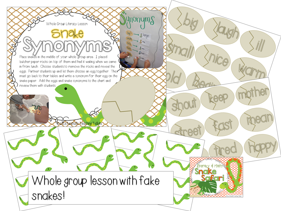 We also did another whole group activity using the snakes and some quick paper eggs I made up. Snake Synonyms!