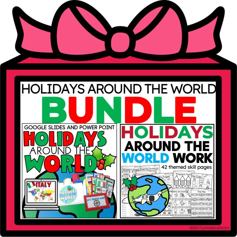 First, we have our resource for studying holidays and Christmas customs around the world both digitally and in print for ease of teaching.ย All of the information and research have been done and paired with accurate and engaging pictures in all formats.ย Students can interact with the screen as they learn about each country and then create paper-based brochures as they fill their travel suitcases and passports.ย This exploration of up to 22 countries can be found here.