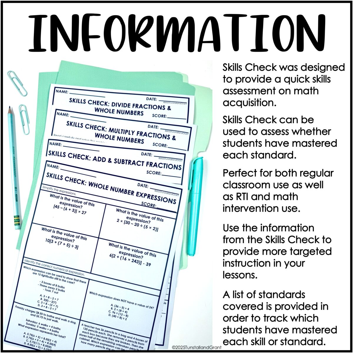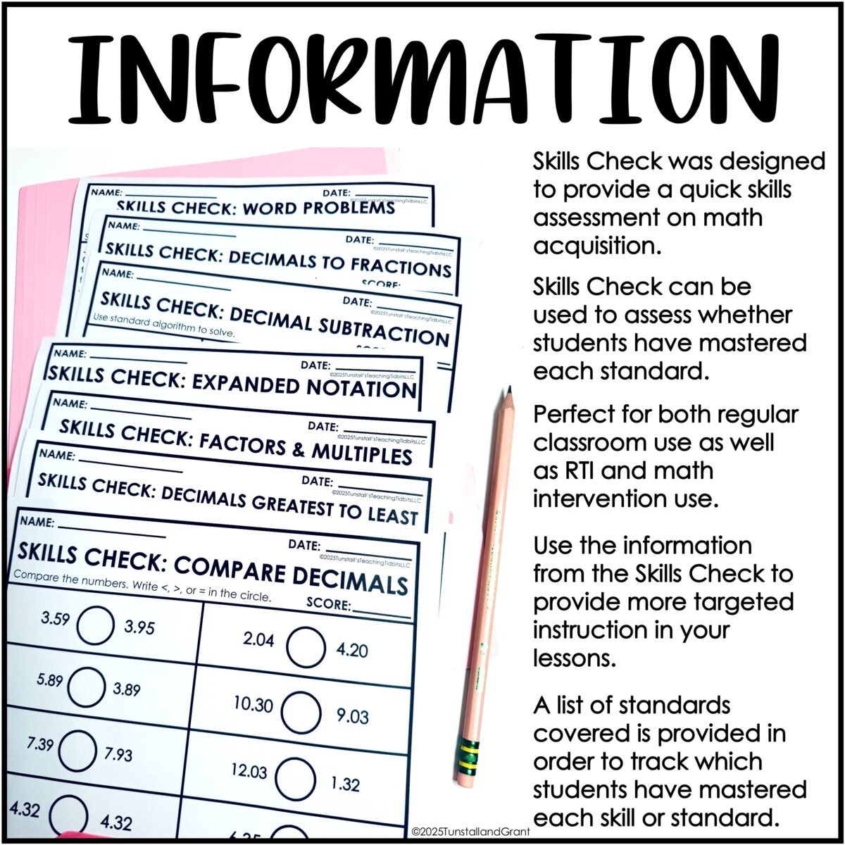 A list of standards covered is provided in order to track which students have mastered each skill or standard. Perfect for both regular classroom use as well as RTI and math intervention use.