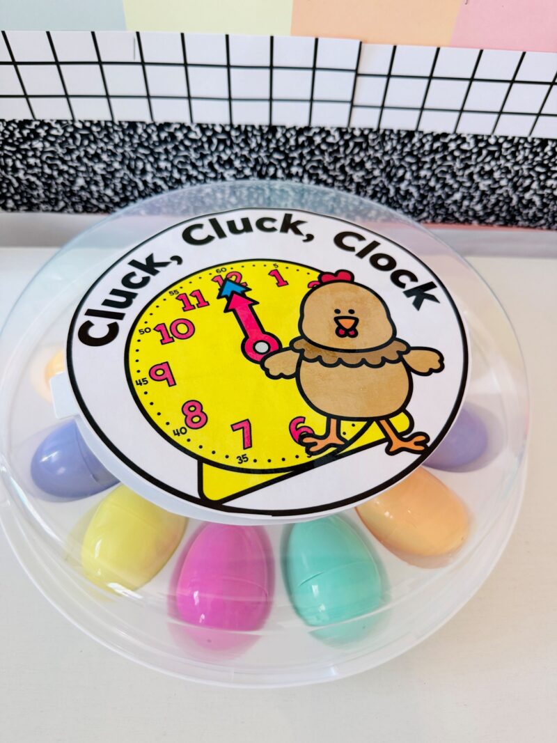 Each number on the spinner matches an egg in the tray. Students open the egg, read the clock, and write the time.